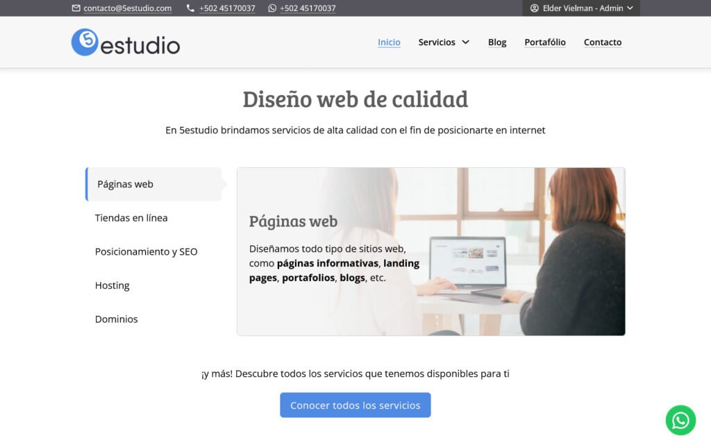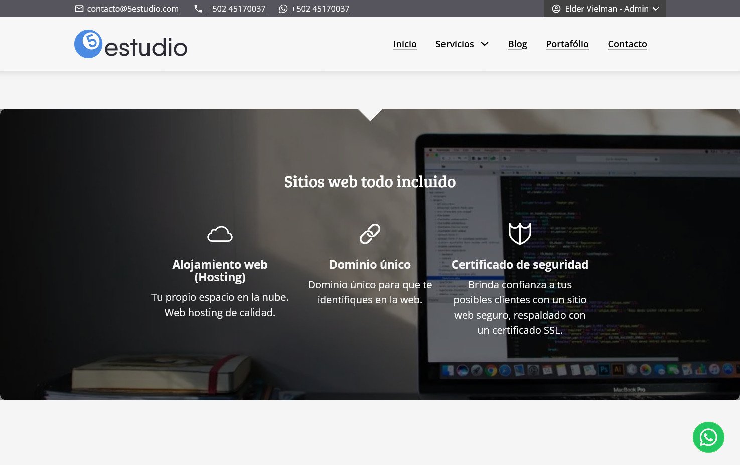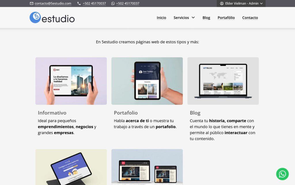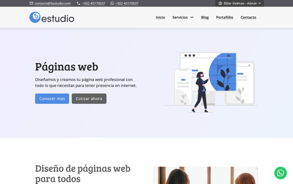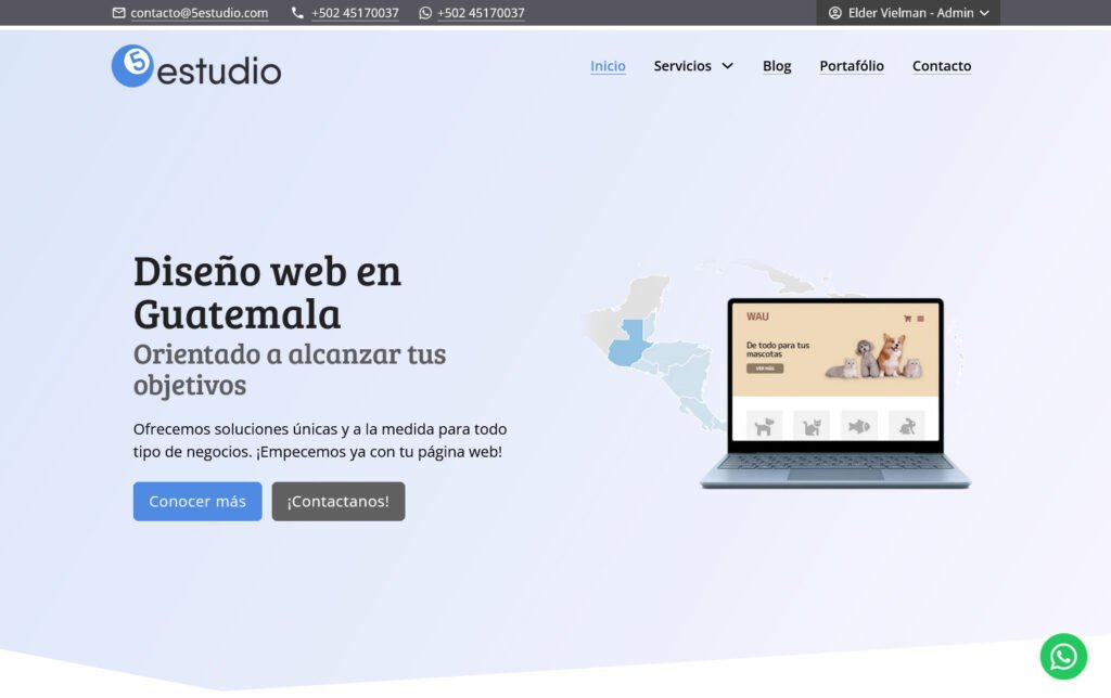 Desarrollo del sitio web para 5estudio, una agencia guatemalteca de diseño web, community management y publicidad. El proyecto se enfocó en crear una presencia digital clara que comunicara sus servicios y fortaleciera su imagen de marca.