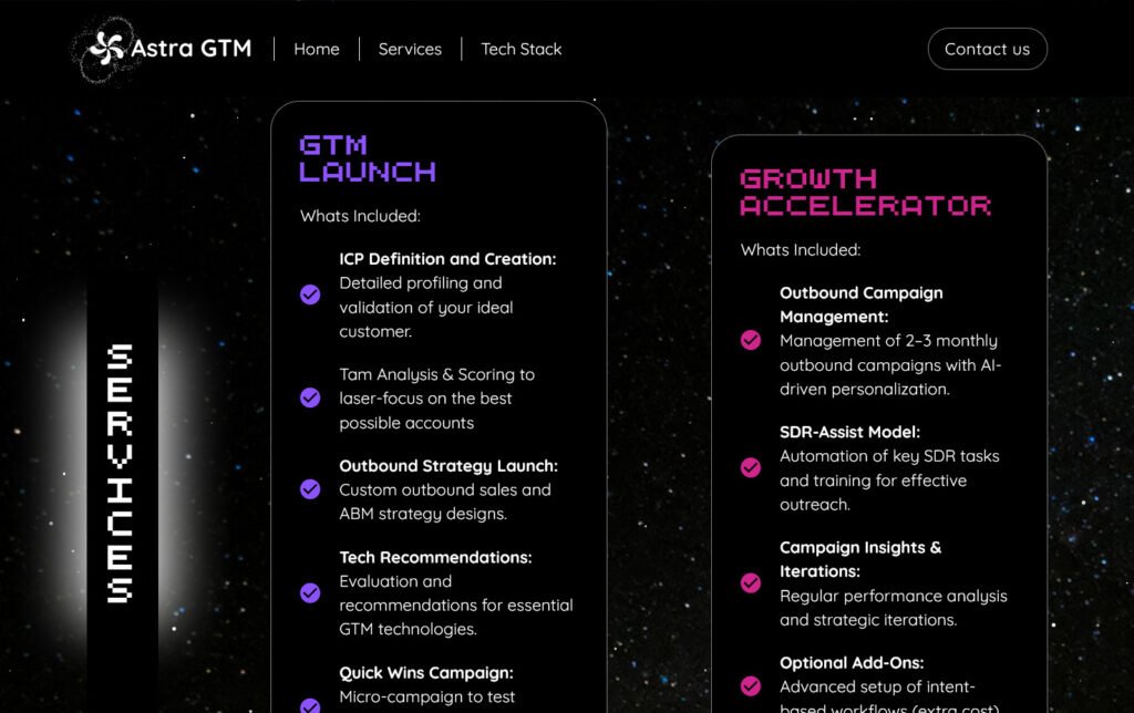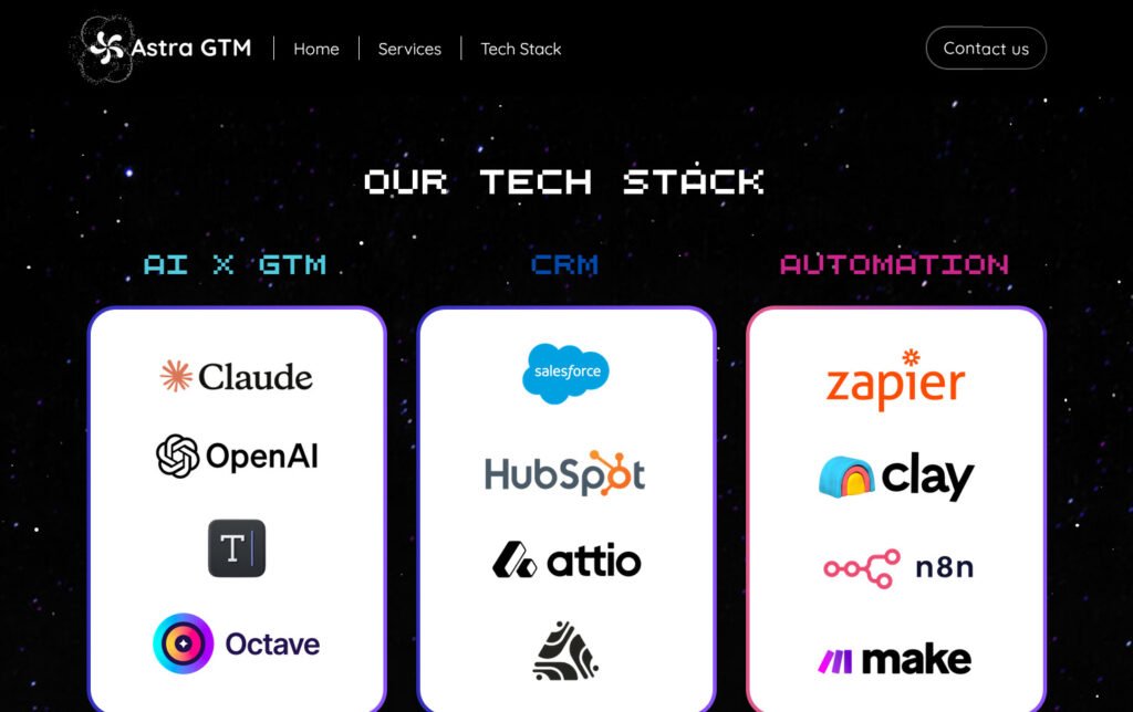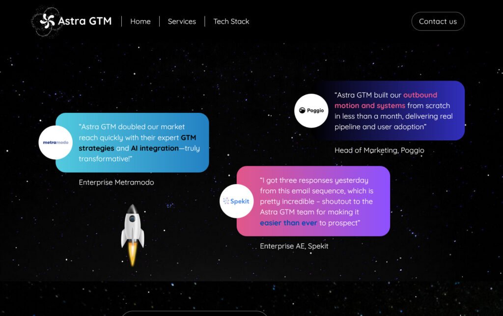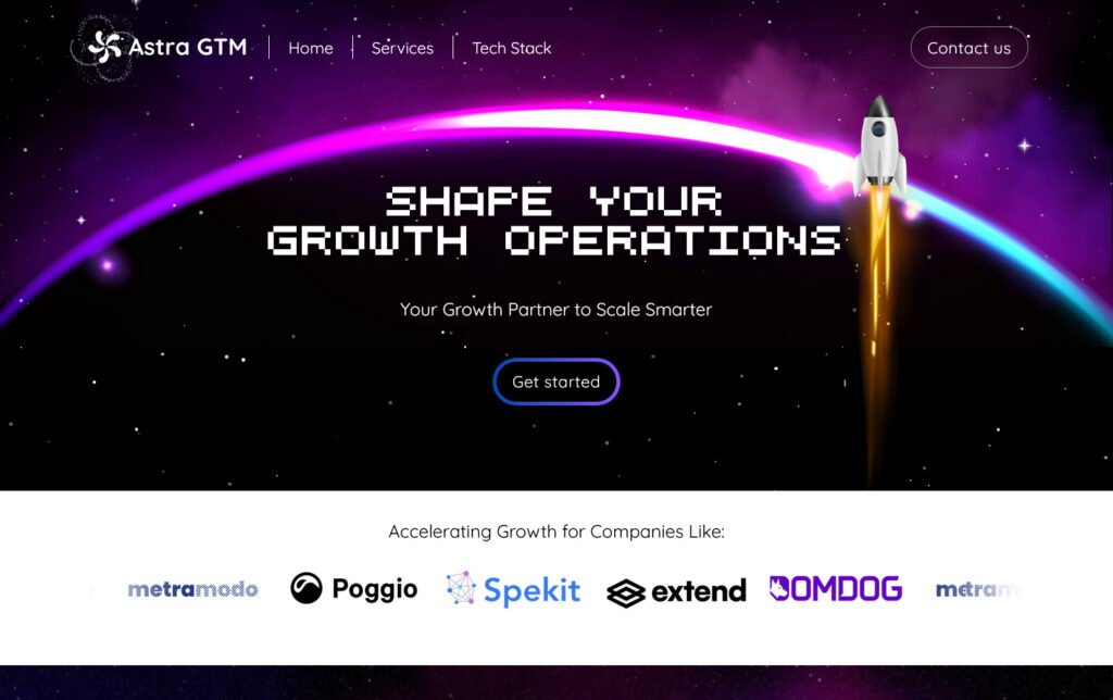 Desarrollo del sitio web para Astra GTM, una empresa enfocada en estrategias de crecimiento y go-to-market con apoyo en tecnologías y procesos avanzados. El proyecto se centró en construir una presencia digital clara y alineada a sus servicios de consultoría y expansión de negocios