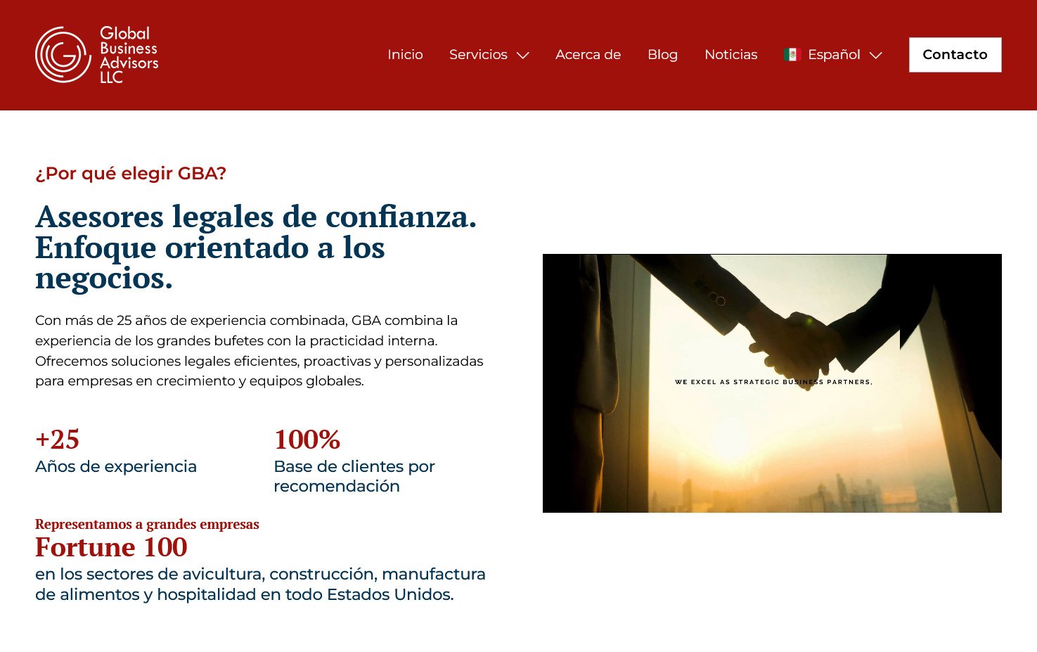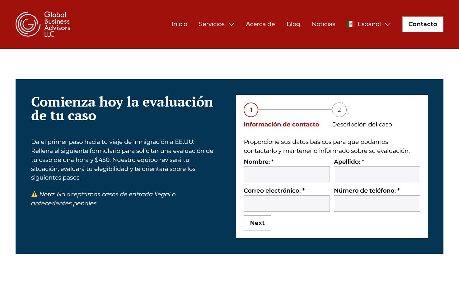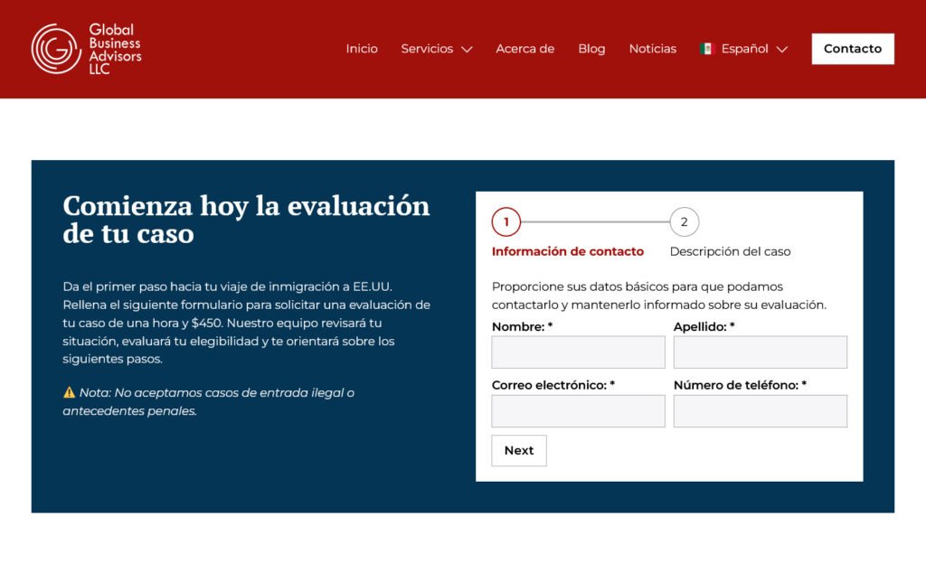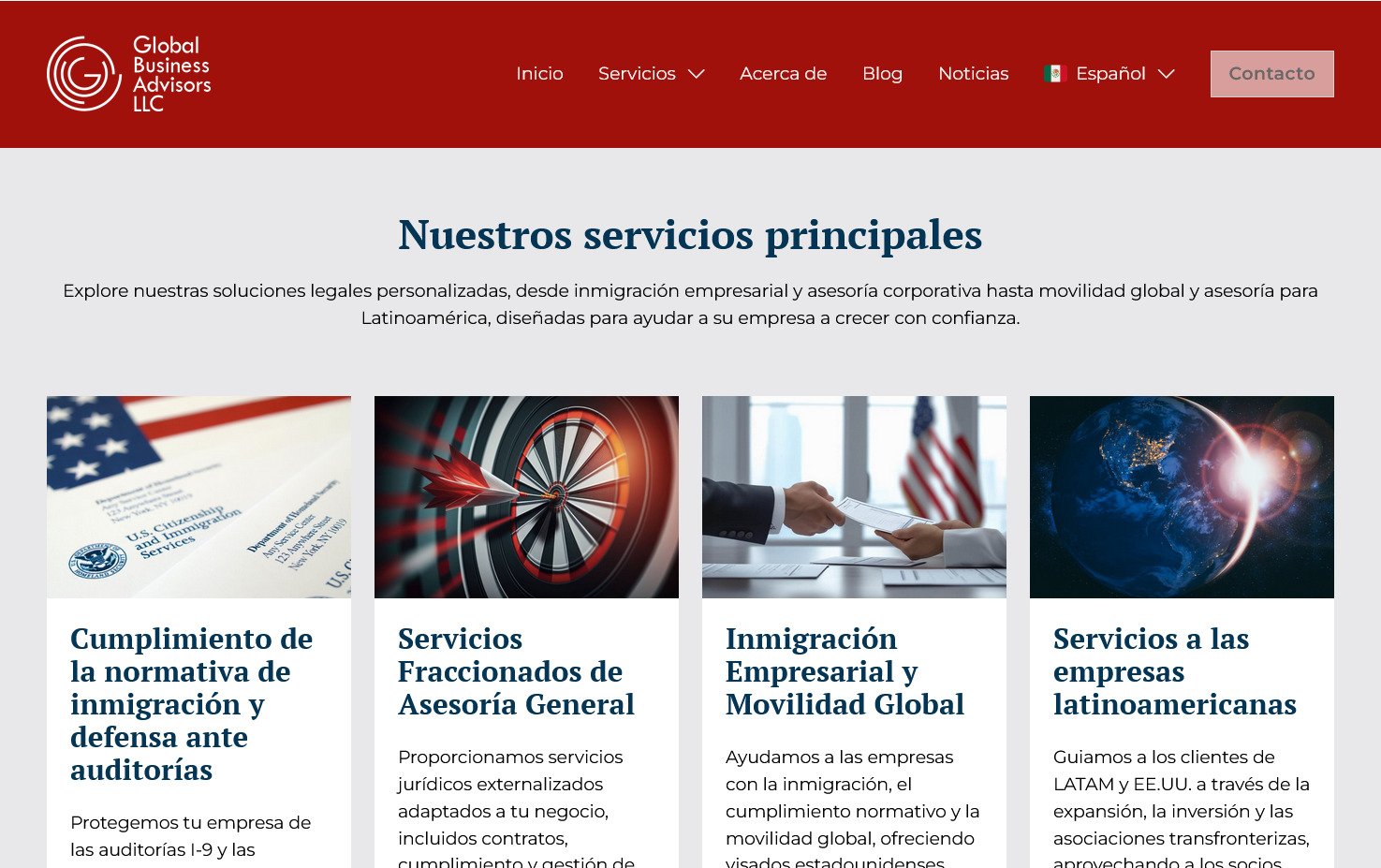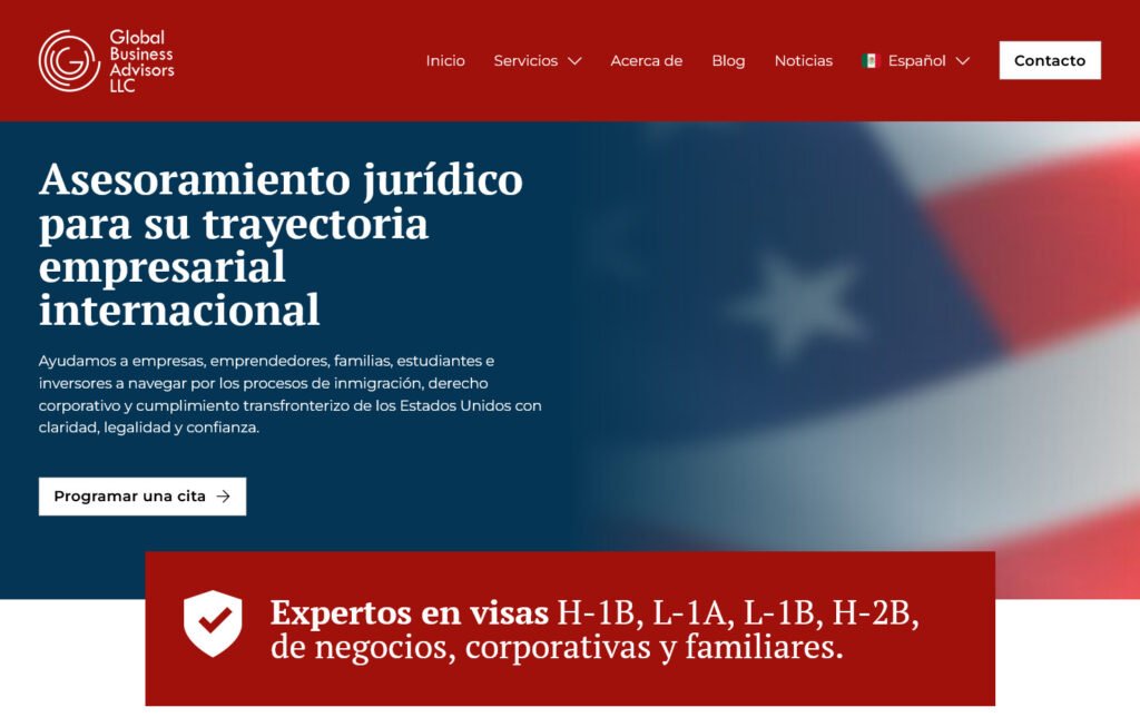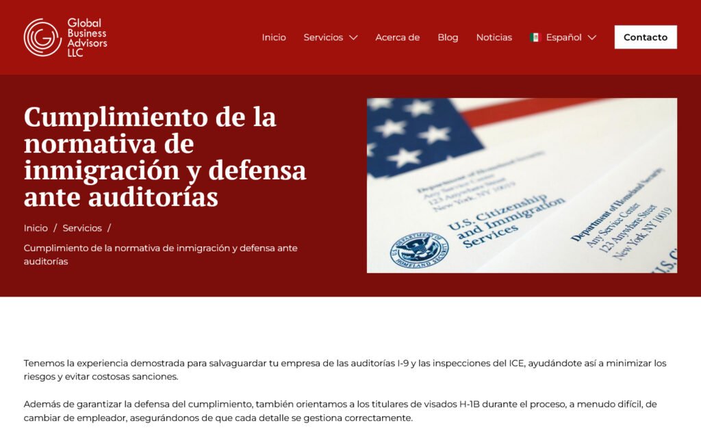 Actualización del sitio web de Global Business Advisors, una firma liderada por una abogada especializada en temas migratorios y defensa empresarial ante auditorías y procesos de ICE. El proyecto se enfocó en mejorar su propuesta web y la claridad de sus servicios.
