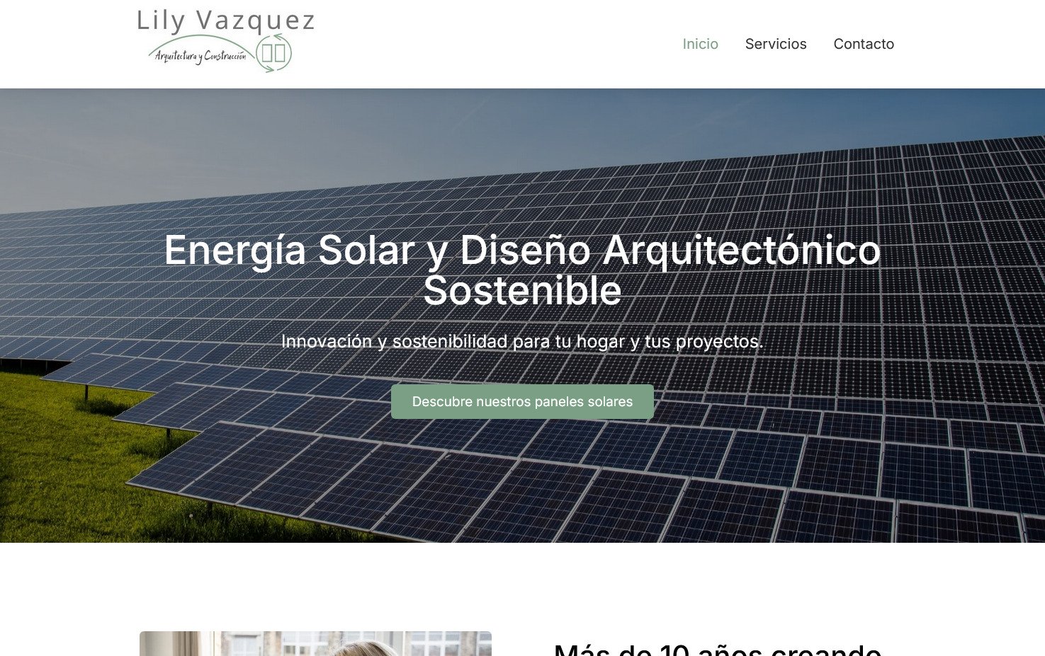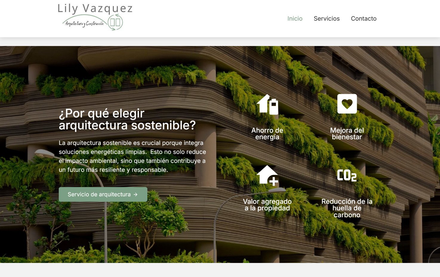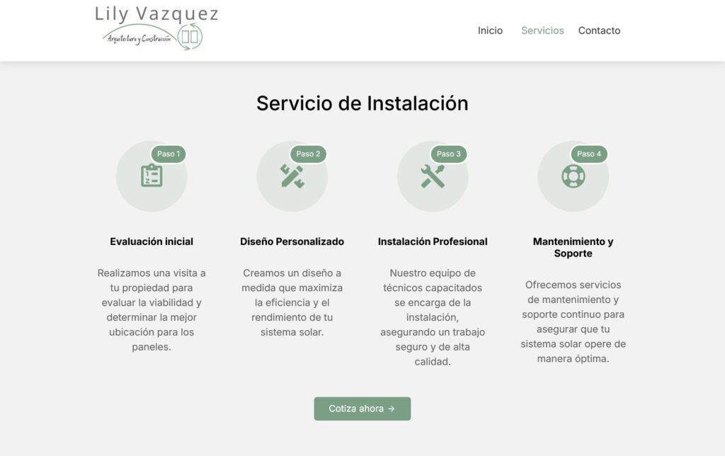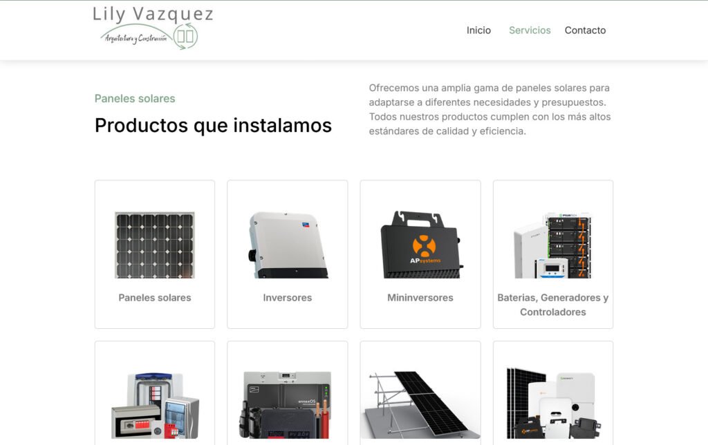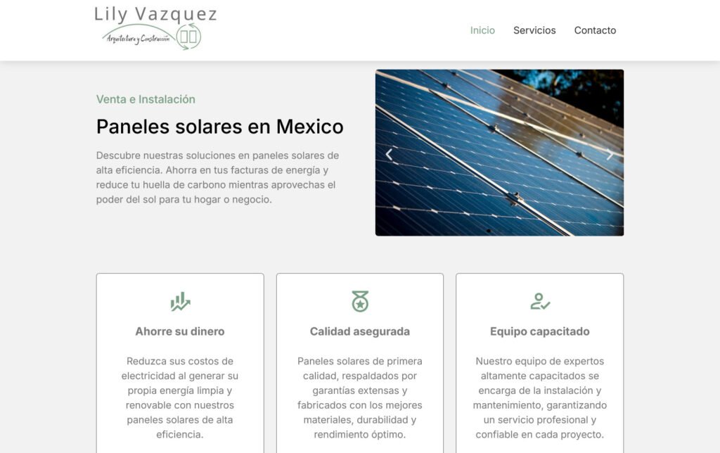 Desarrollo del sitio web para Lily Vasquez, arquitecta especializada en arquitectura sostenible y servicios de venta e instalación de paneles solares. El objetivo fue crear una presencia digital profesional que ayudara a dar a conocer su trabajo y servicios.