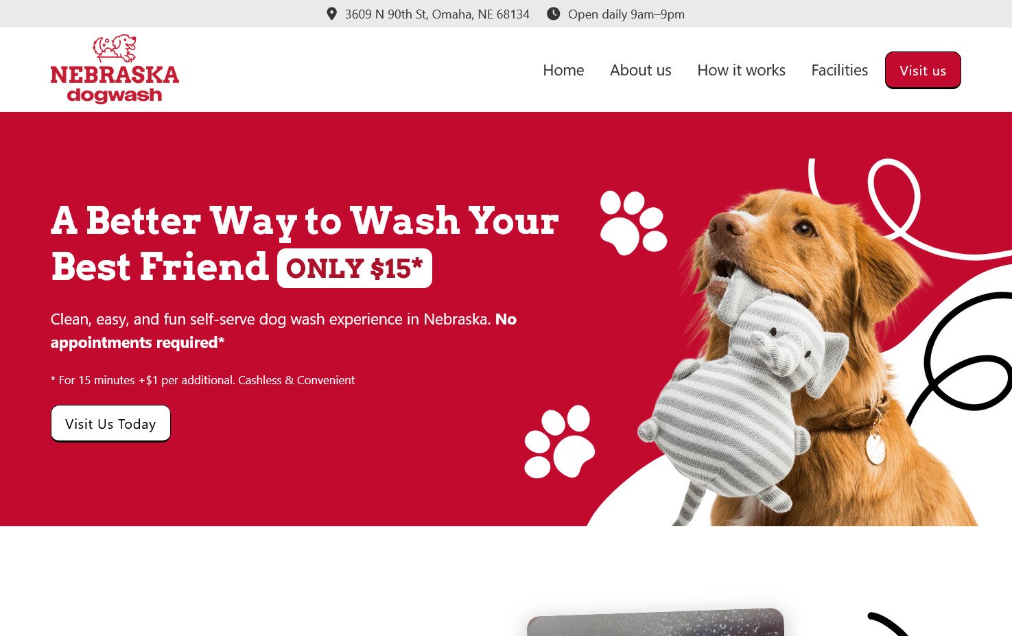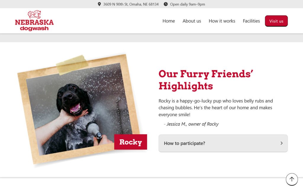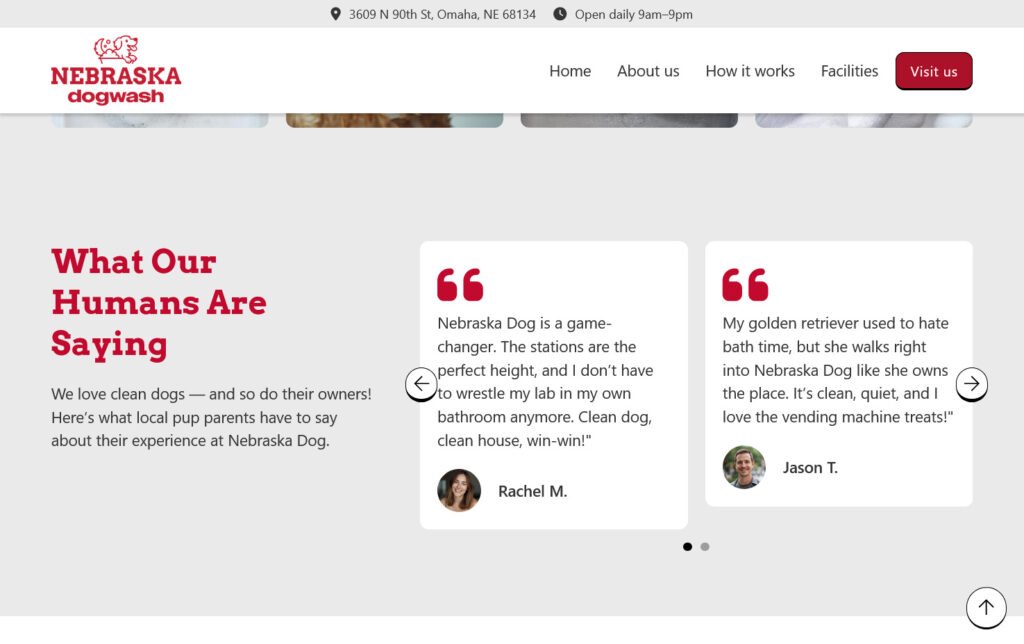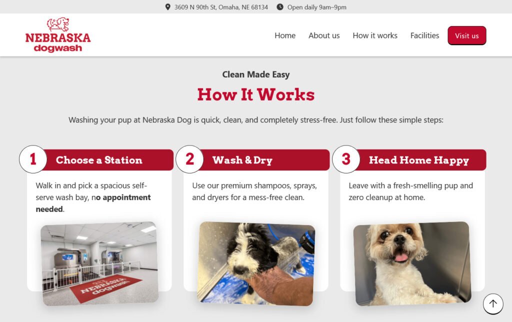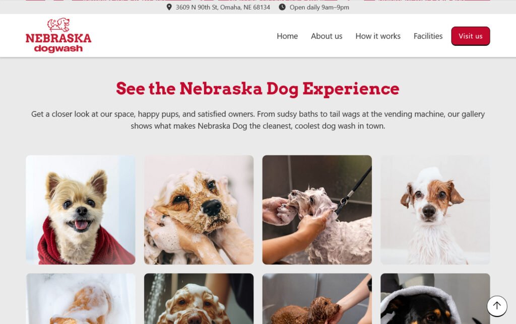 Desarrollo del sitio web para Nebraska Dog Wash, una empresa dedicada a ofrecer espacios y servicios especializados para el baño de perros. El objetivo fue crear una presencia web clara que ayudara a posicionar la marca y comunicar sus servicios.