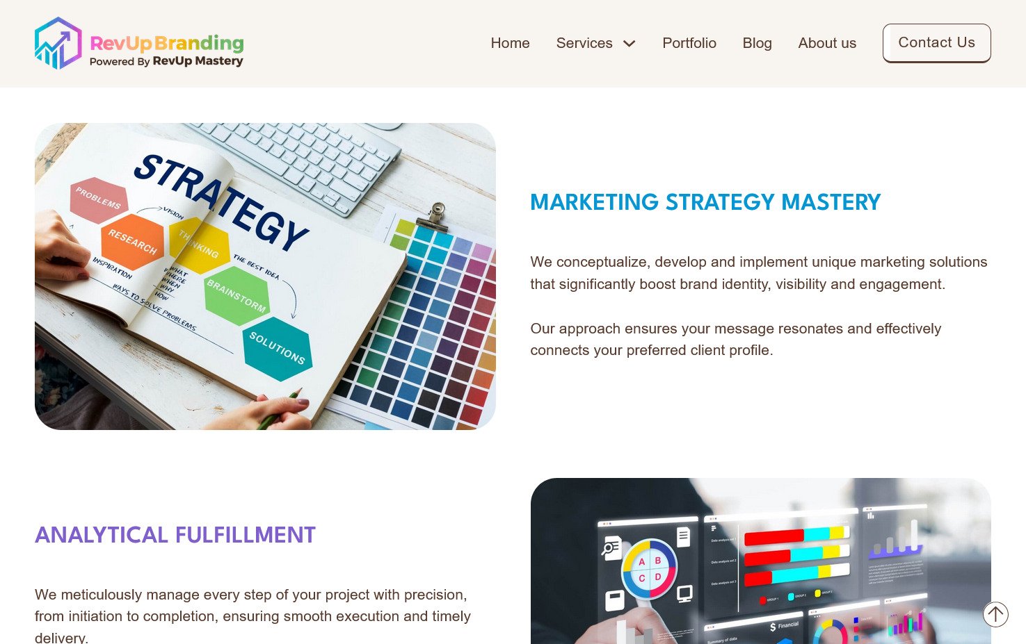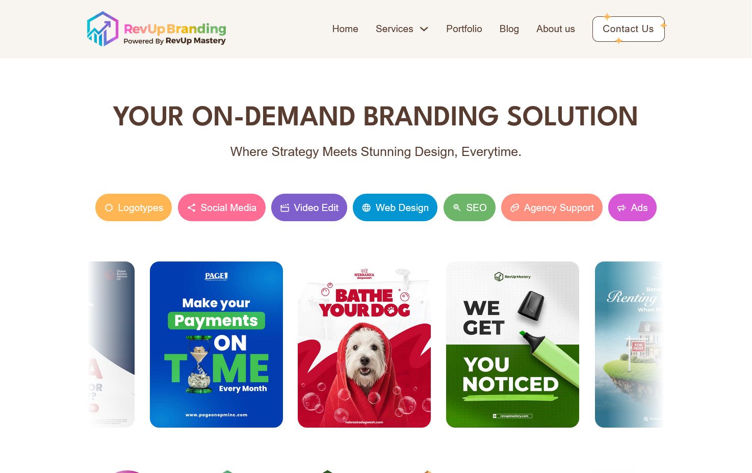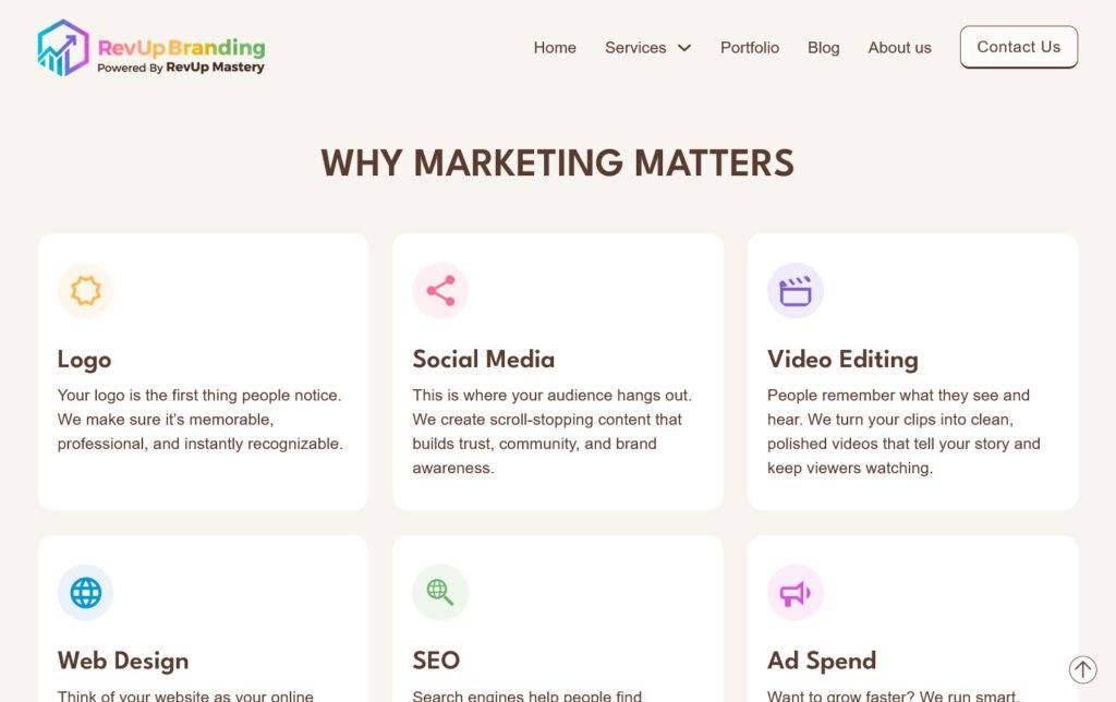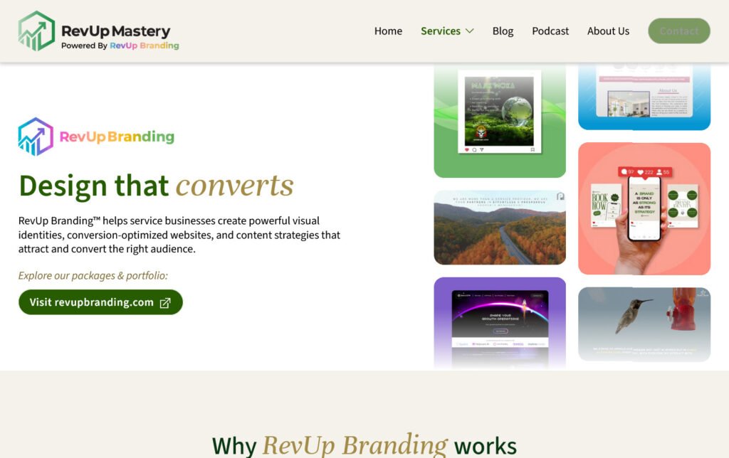 Actualización del sitio web de RevUp Branding, una empresa de servicios de branding. El proyecto se enfocó en mejorar su propuesta web, reforzando la presentación de sus servicios y su identidad visual.