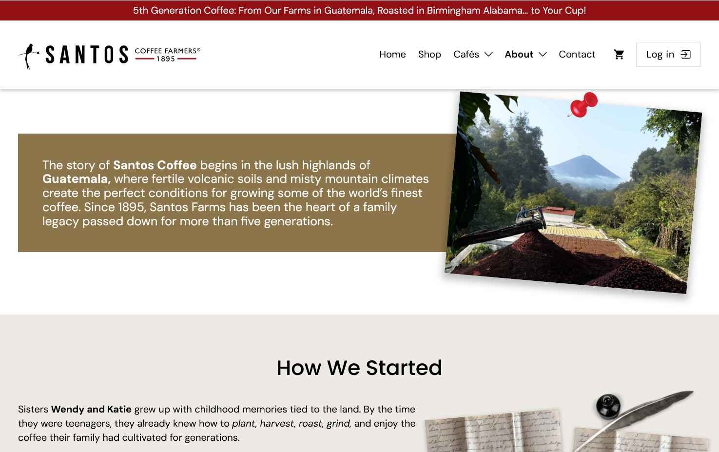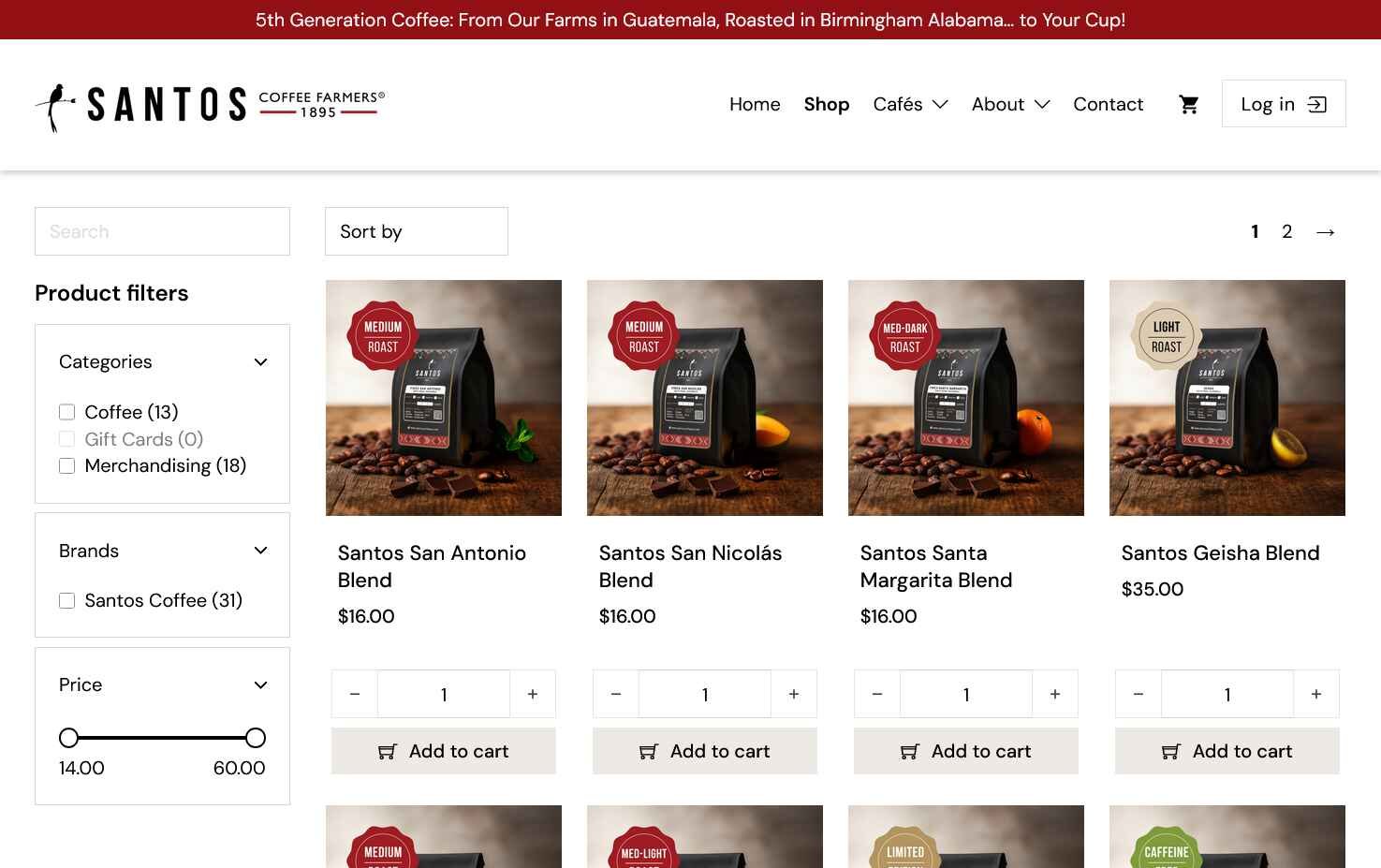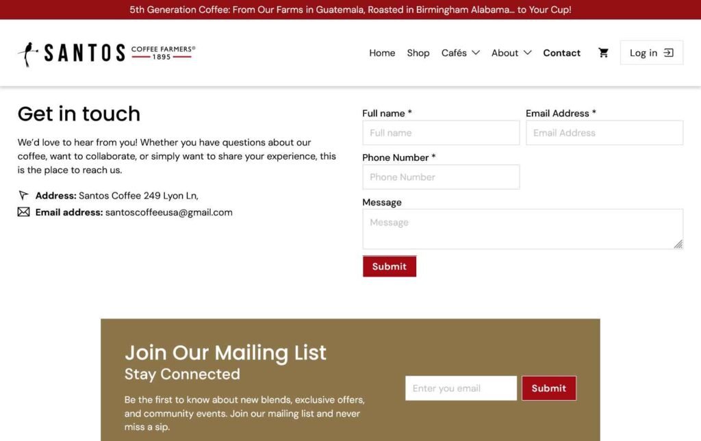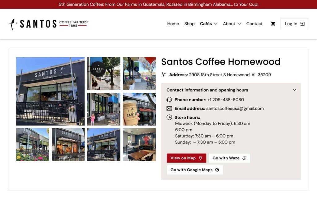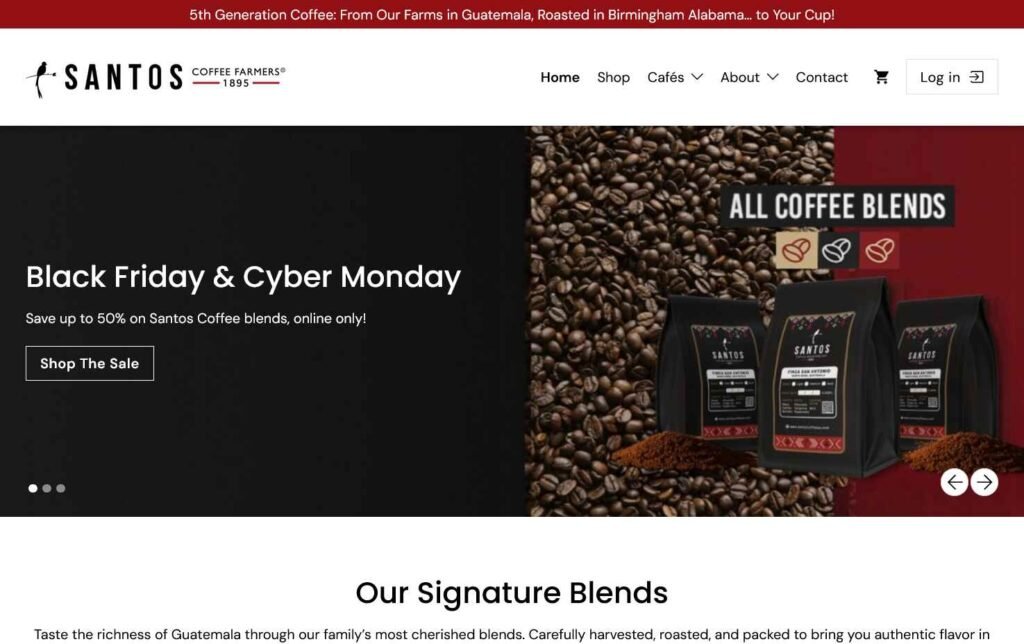 Desarrollo del sitio web y tienda en línea para Santos Coffee Farmers, una cadena guatemalteca de cafeterías en Birmingham, Alabama, con enfoque en mejorar su propuesta web y la experiencia de compra en línea.