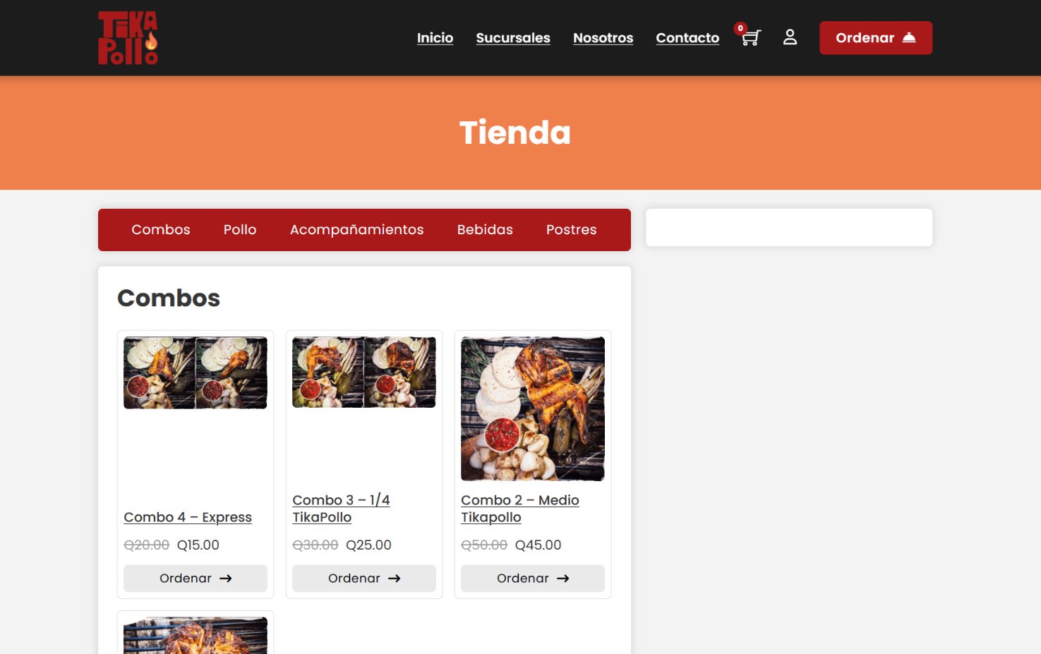 Desarrollo del sitio web y tienda en línea para Tikapollo, un restaurante familiar de pollo asado. El proyecto se enfocó en habilitar la venta en línea y facilitar el proceso de pedidos para sus clientes.